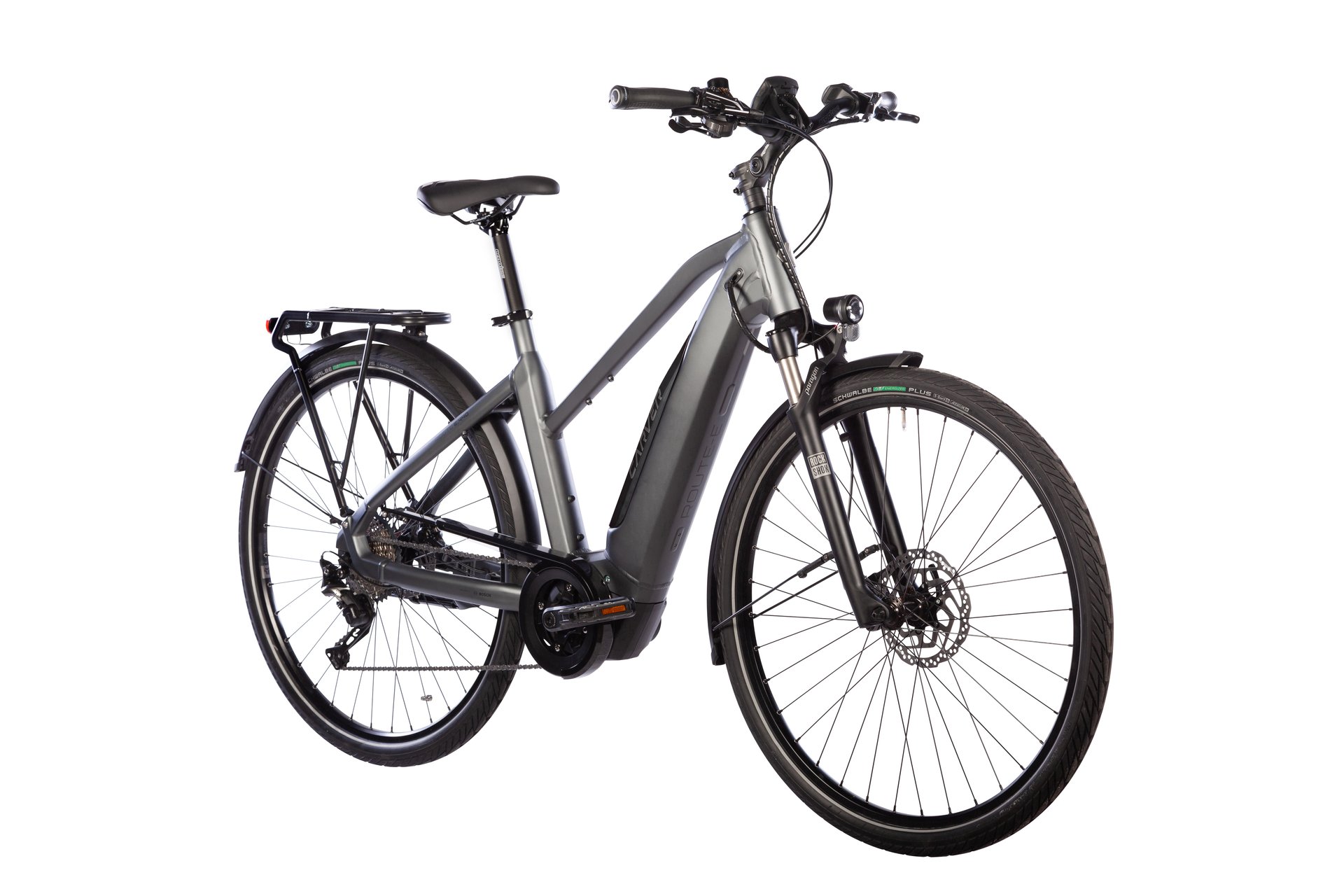Carver Route E.440 Dafür sorgt der schöne Damen Sport Rahmen aus Aluminium und der sinnig platzierte 500 Wh Intube-Akku. Gemeinsam mit den 28″ Laufrädern geht es daher zügig voran.